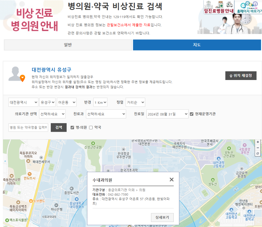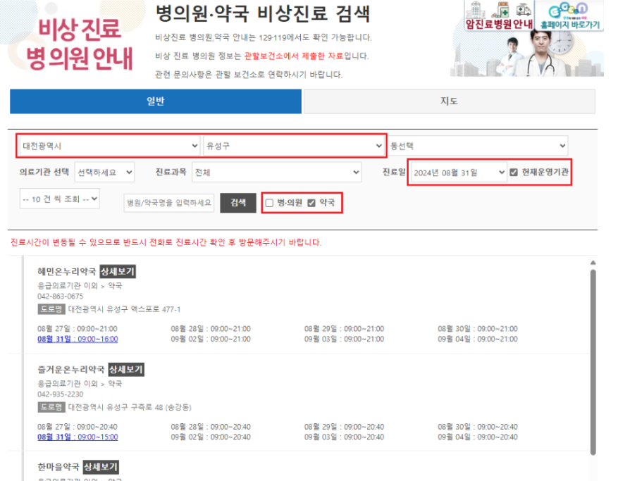 본인이 방문할 지역을 선택한 뒤, 날짜, 병의원과 약국을 선택한 뒤 검색하면 현재 진료 중인 병의원 및 약국 목록 확인이 가능합니다.